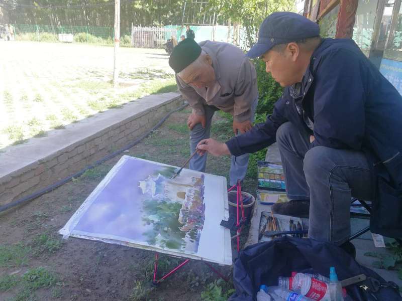 根据行程安排,6月7日至10日,采风团一行先后来到福寿山、果子沟、赛里木湖、惠远古城、丝路农桑园、解忧公主薰衣草农场等地采风写生。每到一个景点,艺术家们都迫不及待地拿出画板和相机,记录下最美的画面,国画、油画、水粉画,艺术家们用手中的画笔,描绘出一幅幅生动绚丽的霍城自然风光画卷。他们潜心创作的身影,成为了一道亮丽的风景线,吸引了过往的游客,驻足欣赏和赞美。在惠远古城的一个农家小院里,品尝完当地特色美食的他们,中午顾不上休息,拿起画板画起了色彩纷呈的居民院落和维吾尔族人物肖像。相处的这几天,老师们感动于我们细心周到的陪同,我们也从老师们的身上感受到了他们的敬业、专注、执着、认真以及先进的思想理念,这一切都让我受益匪浅,深受感动,不由产生崇敬之情。从刚开始的陌生到渐渐熟悉,再成为朋友,共同度过了短暂而美好的四天。