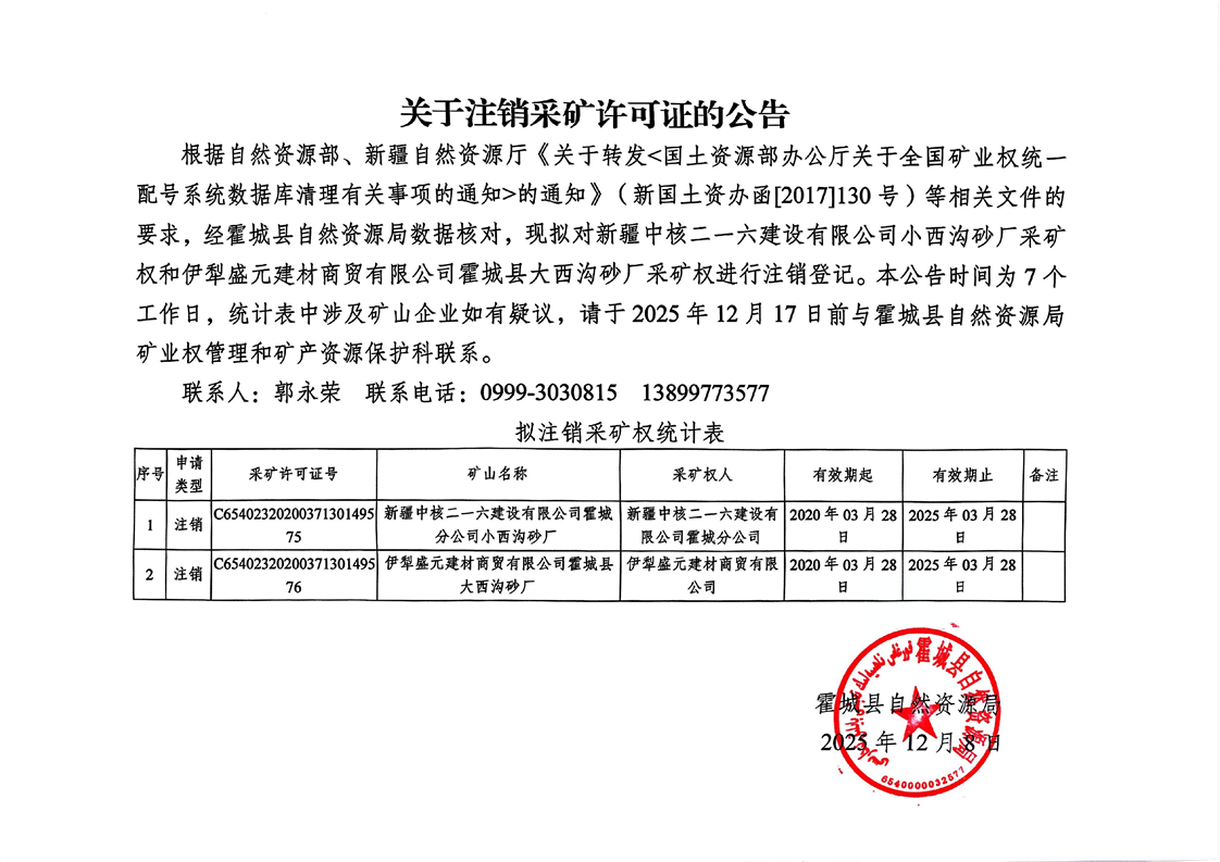 关于注销采矿权许可证的公告