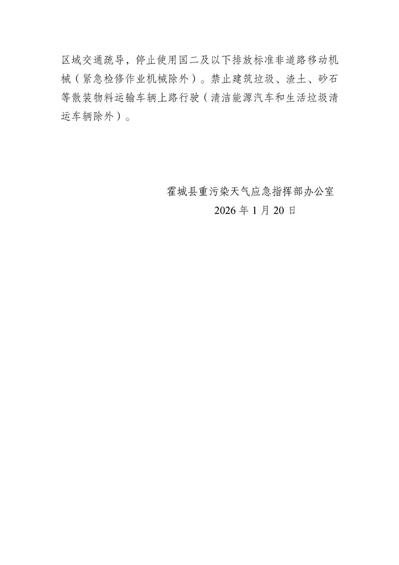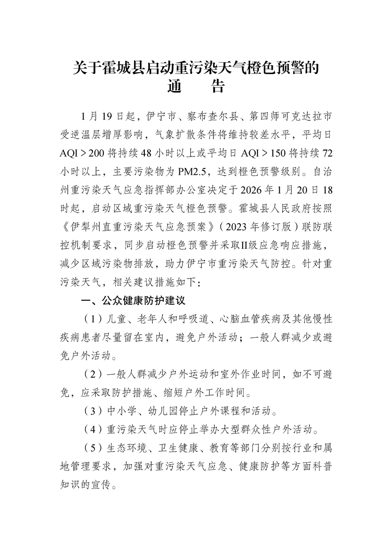 关于霍城县启动重污染天气橙色预警的通告
