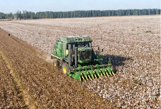 金秋十月,三道河乡2300亩棉花迎来采收旺季,棉田里棉桃满枝竞相绽放,吐出朵朵白絮,大型采棉机穿梭在田间地头作业。
