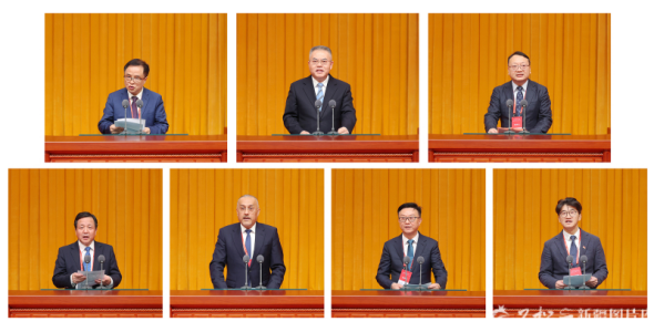 11月18日,在2025新商大会上,中国工程院院士彭苏萍、中国华电集团总经理叶向东、浙江恒逸集团总裁倪德锋、特变电工董事长张新、阿联酋中国新疆商会暨同乡会会长阿不来提·买买提、上海新疆商会会长韩宇泽发言。新商联盟主席杨剑发布联盟倡议(由上至下、由左到右)。石榴云/新疆日报记者崔志坚摄