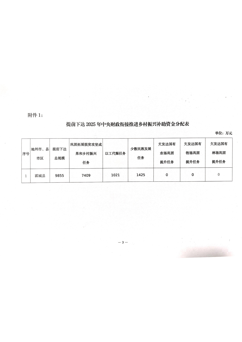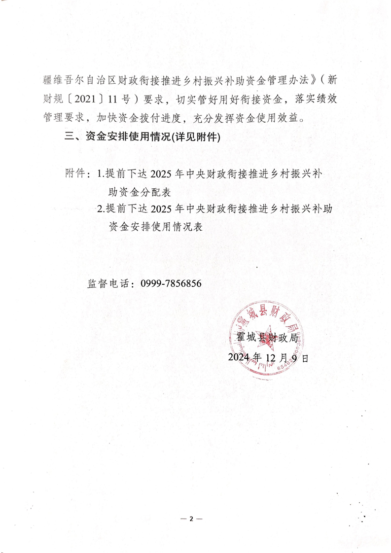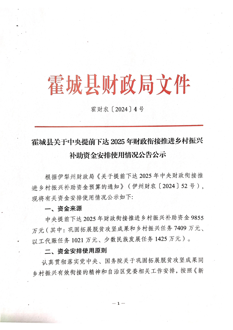 霍城县关于中央提前下达2025年财政衔接推进乡村振兴补助资金安排使用情况公告公示