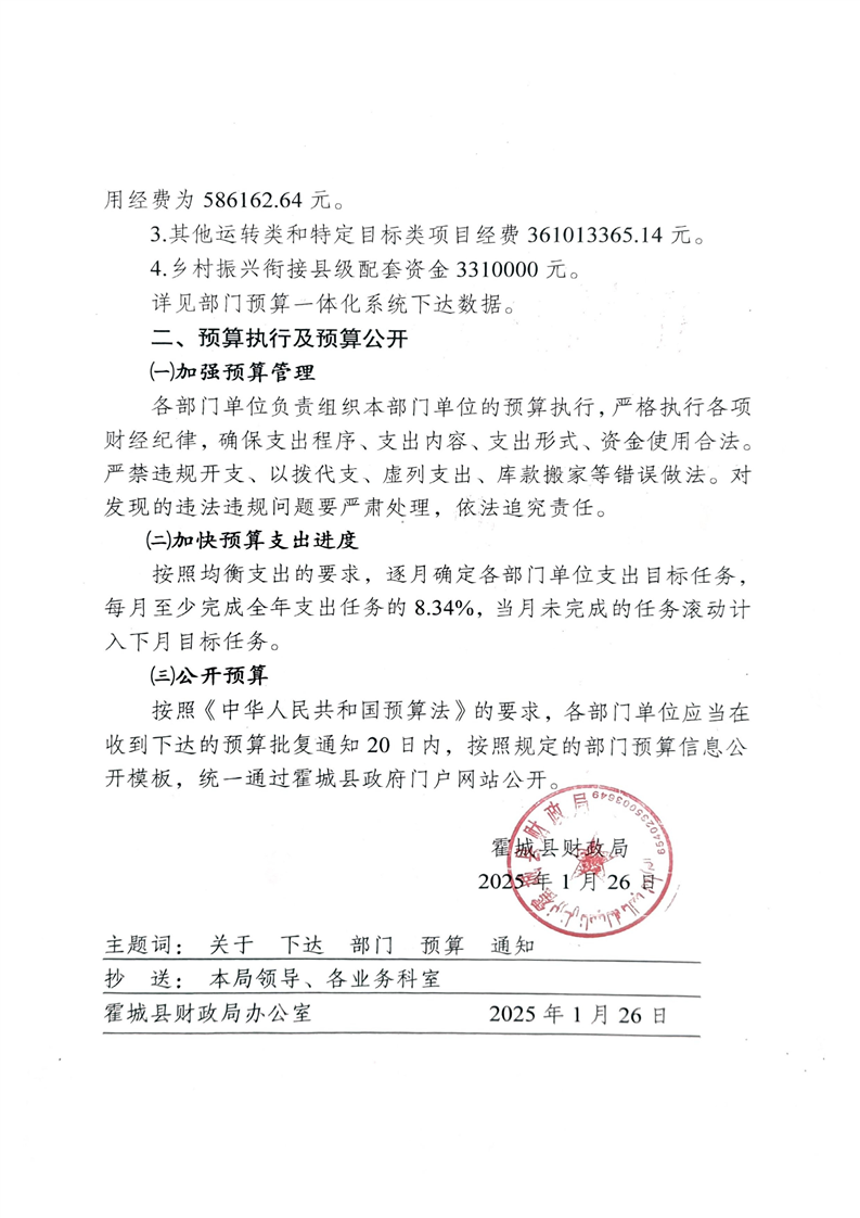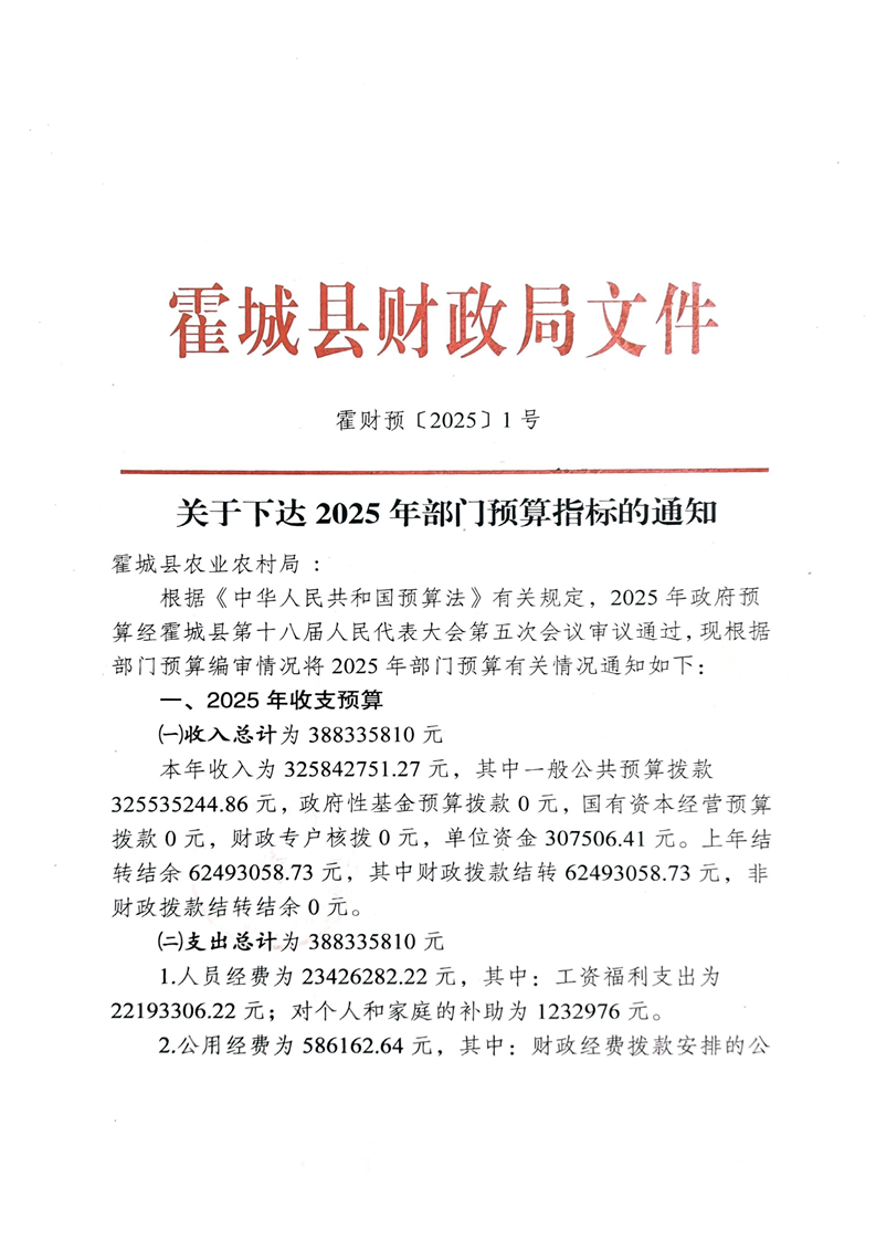 关于下达霍城县农业农村局2025年预算指标的通知