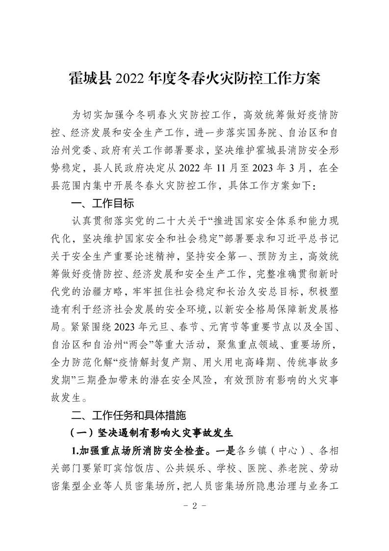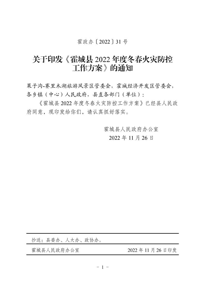 关于印发《霍城县2022年度冬春火灾防控工作方案》的通知