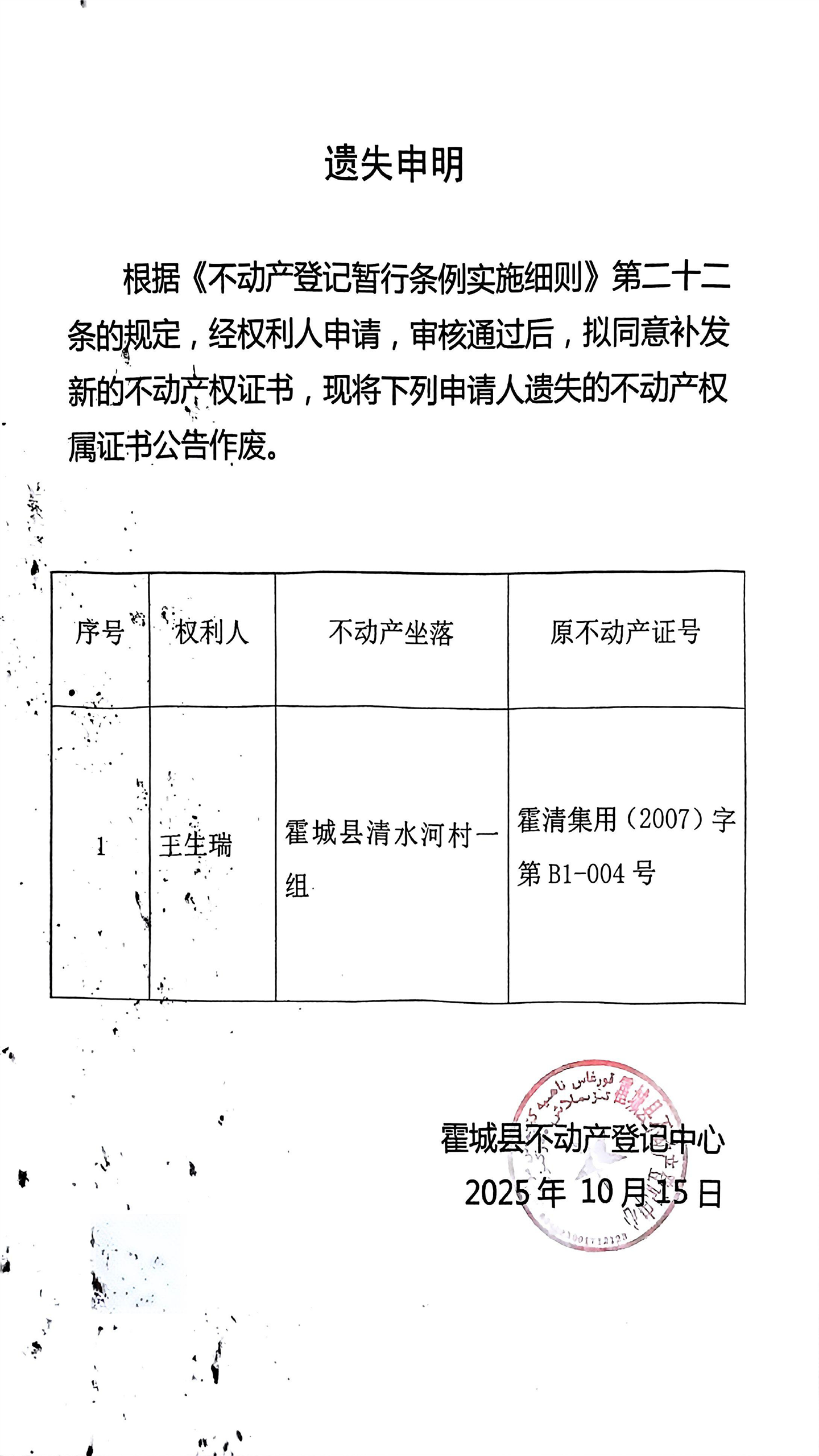 王生瑞遗失申明