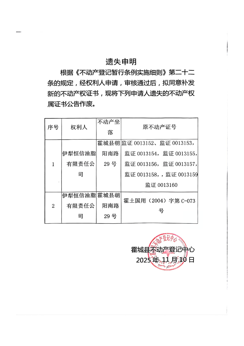 伊犁恒信油脂有限责任公司遗失声明