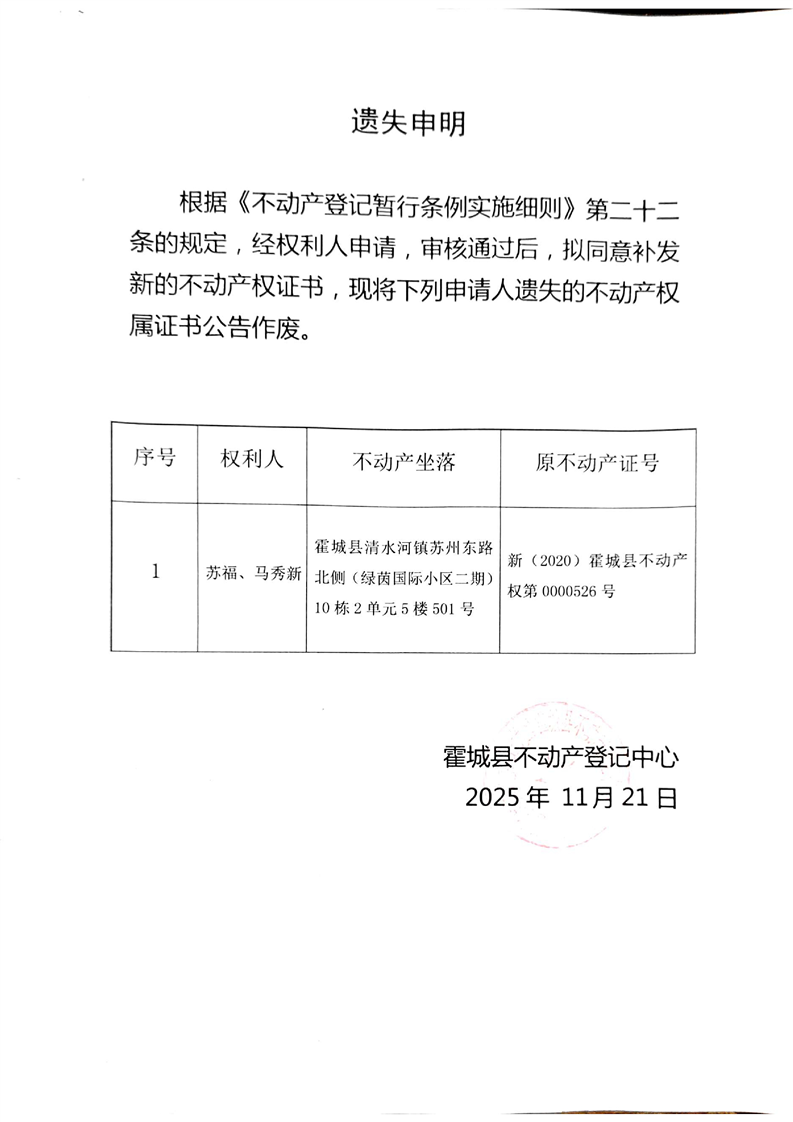 苏福、马秀新遗失申明