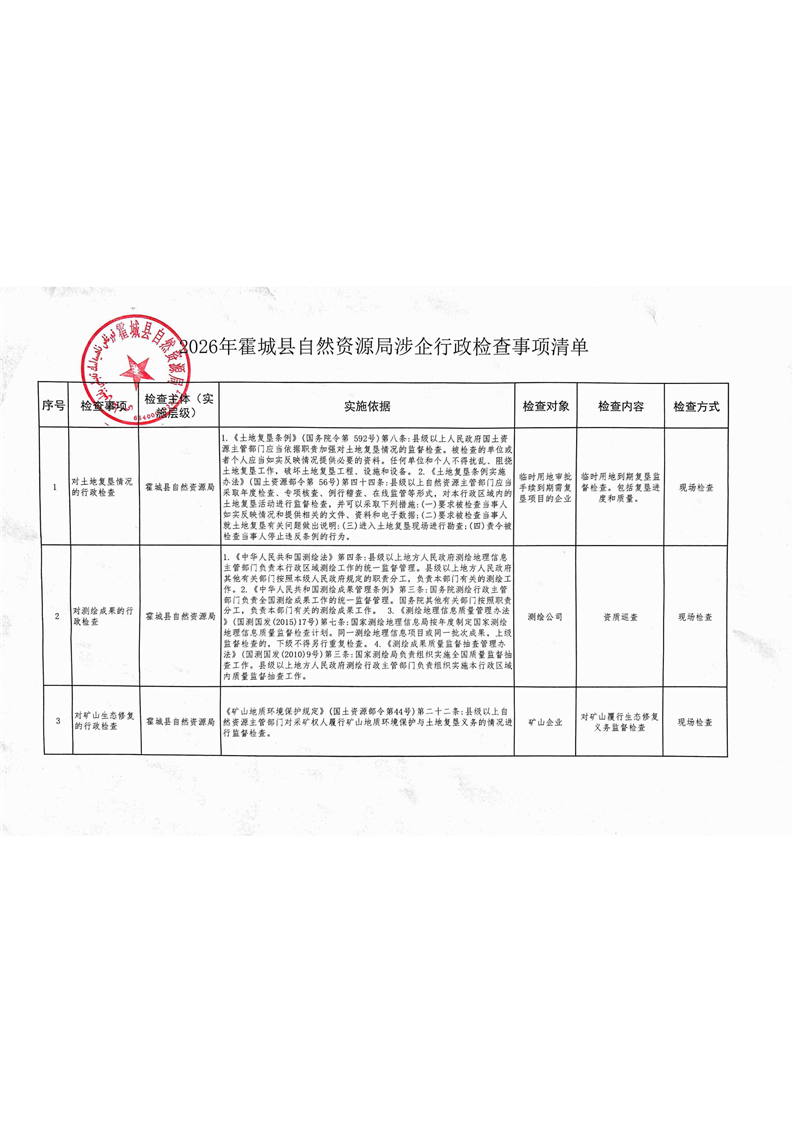 2026年霍城县自然资源局涉企行政检查事项清单