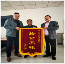 10月10日上午,乘客艾女士将一面印有“拾金不昧”的锦旗送到霍城县阳光河谷出租车服务有限公司,紧紧握住驾驶员阿师傅的手表达感激,现场暖意融融。