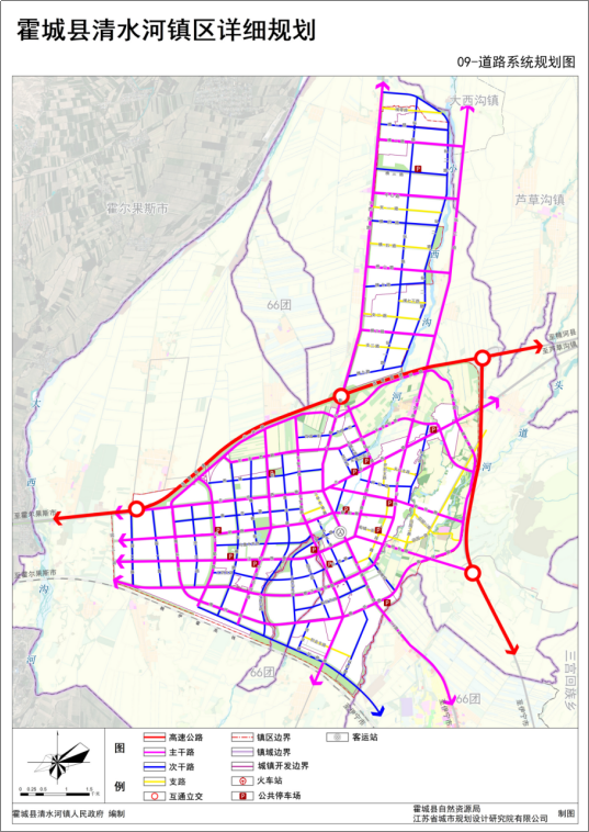 统筹考虑未来清水河镇区与周边区域一体化的发展,强化清水河镇区与霍城县城、霍尔果斯等区域的交通联系,完善对外交通体系,优化内部交通组织与道路断面,形成布局合理的镇区路网骨架体系。结合用地更新,梳理道路功能,引导用地功能布局优化,形成交通与土地利用一体化的布局模式。