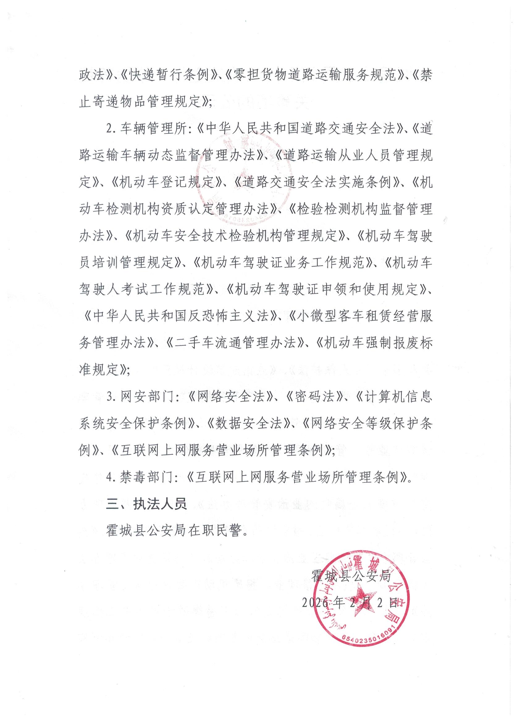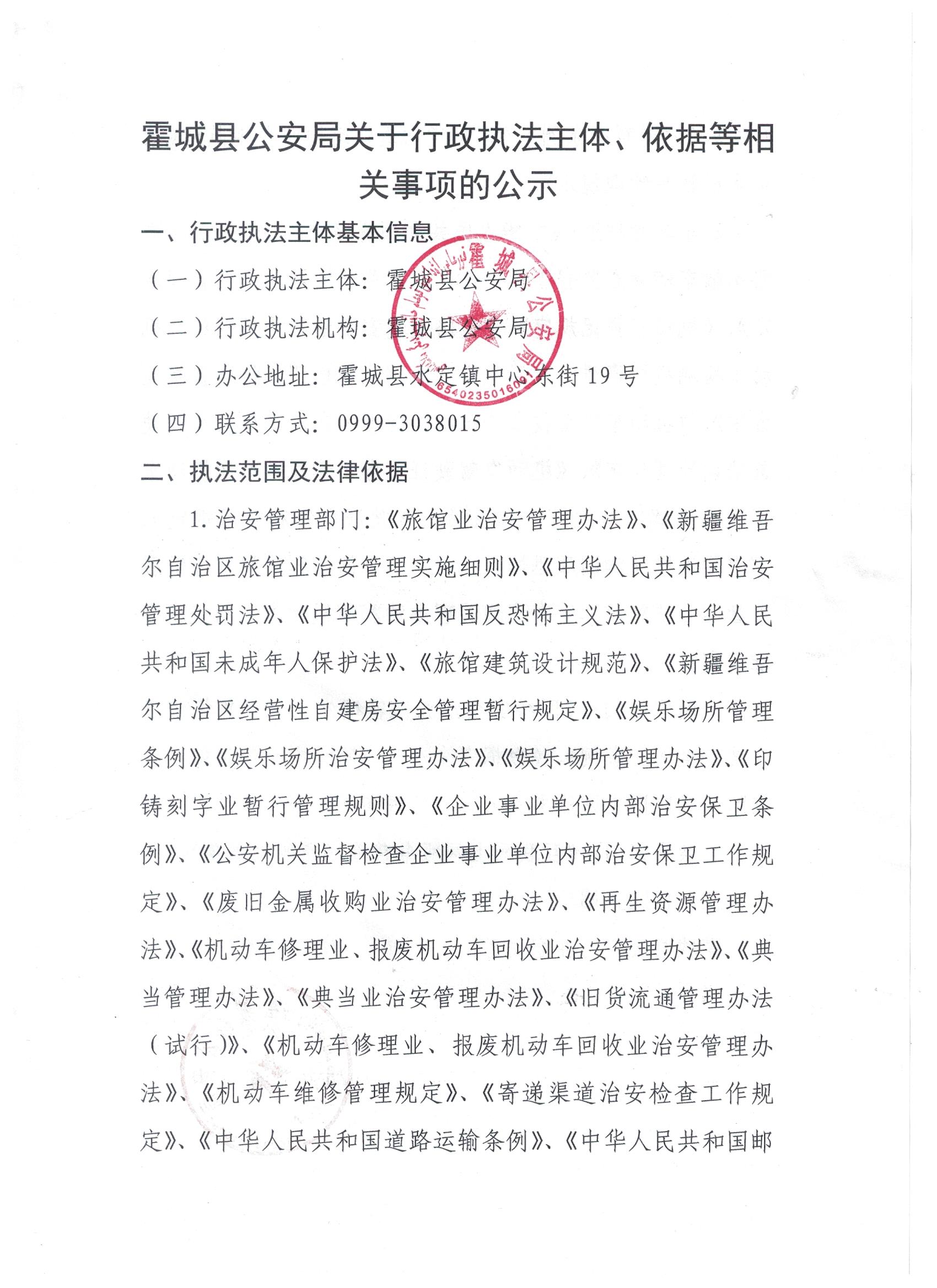 霍城县公安局关于行政执法主体、依据等相关事项的公示