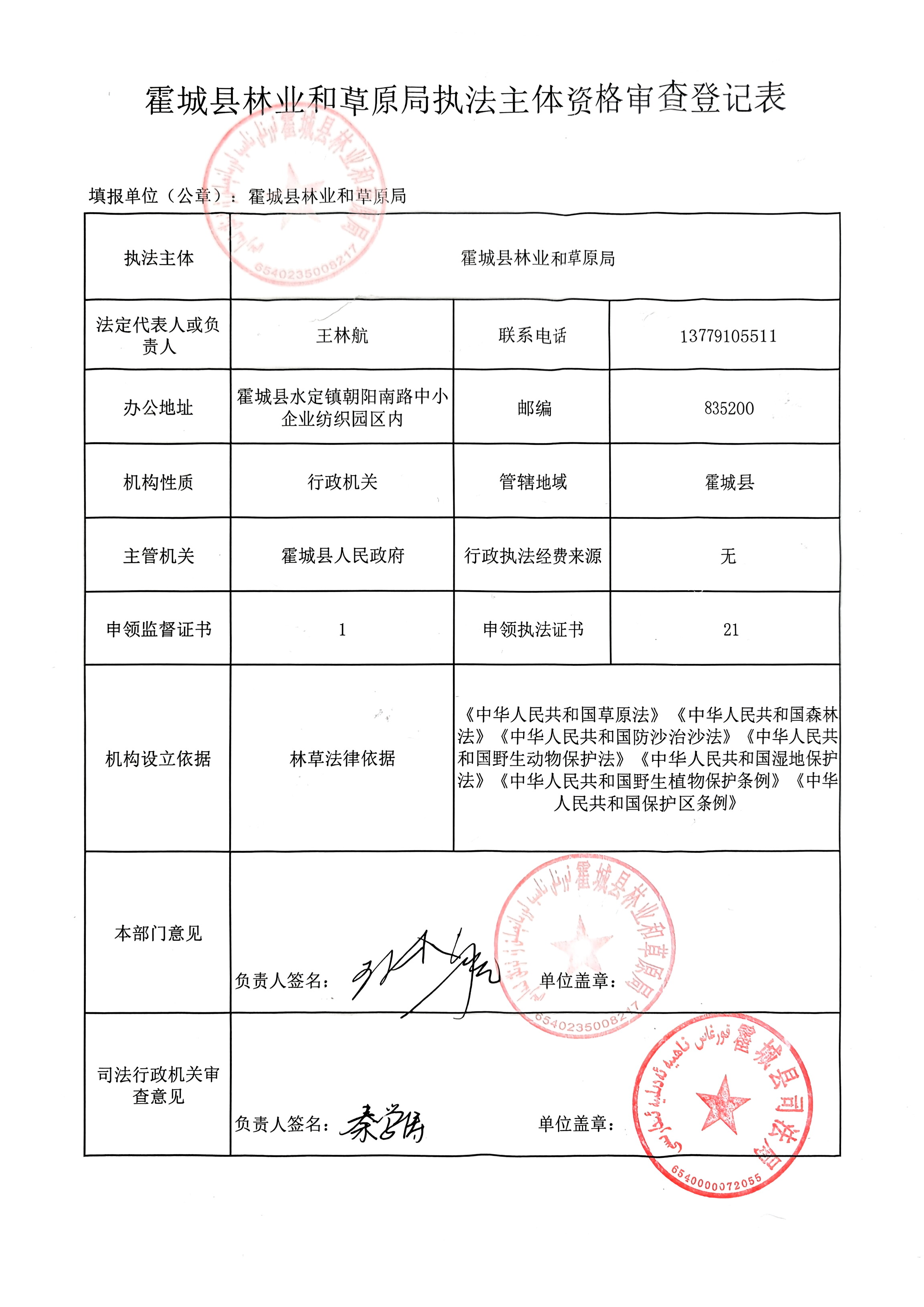 霍城县林业和草原局执法主体资格审查登记表