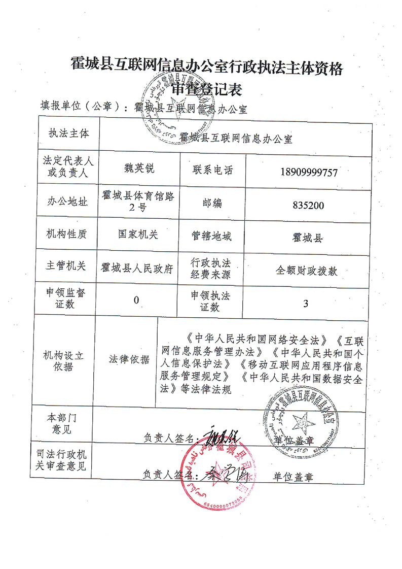 霍城县互联网信息办公室行政执法主体资格审查登记表