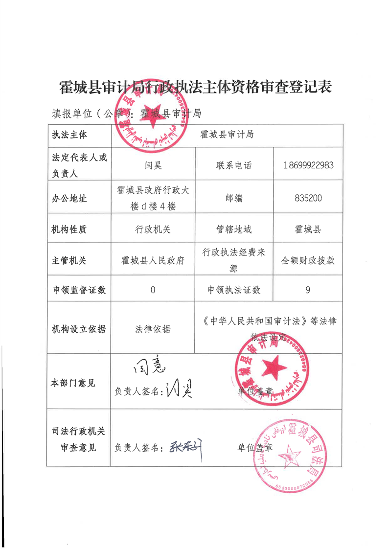 霍城县审计局行政执法主体资格审查登记表