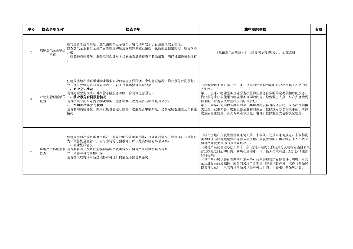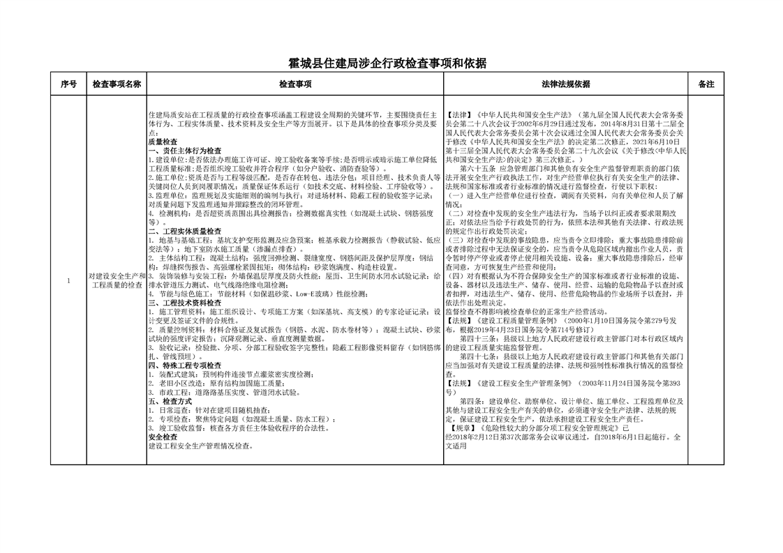 霍城县住建局涉企行政检查事项清单