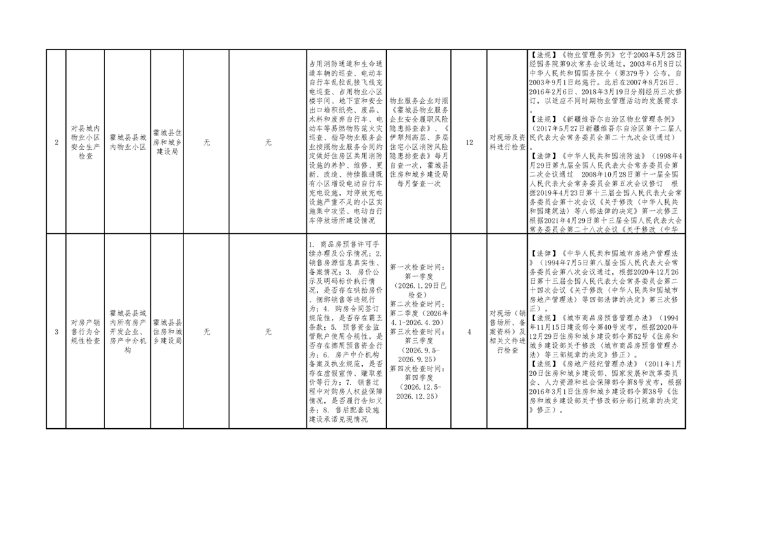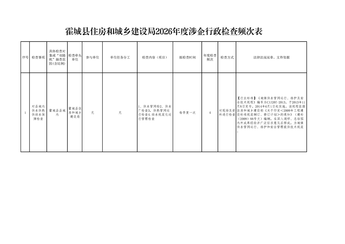 霍城县住房和城乡建设局2026年度涉企行政检查频次表
