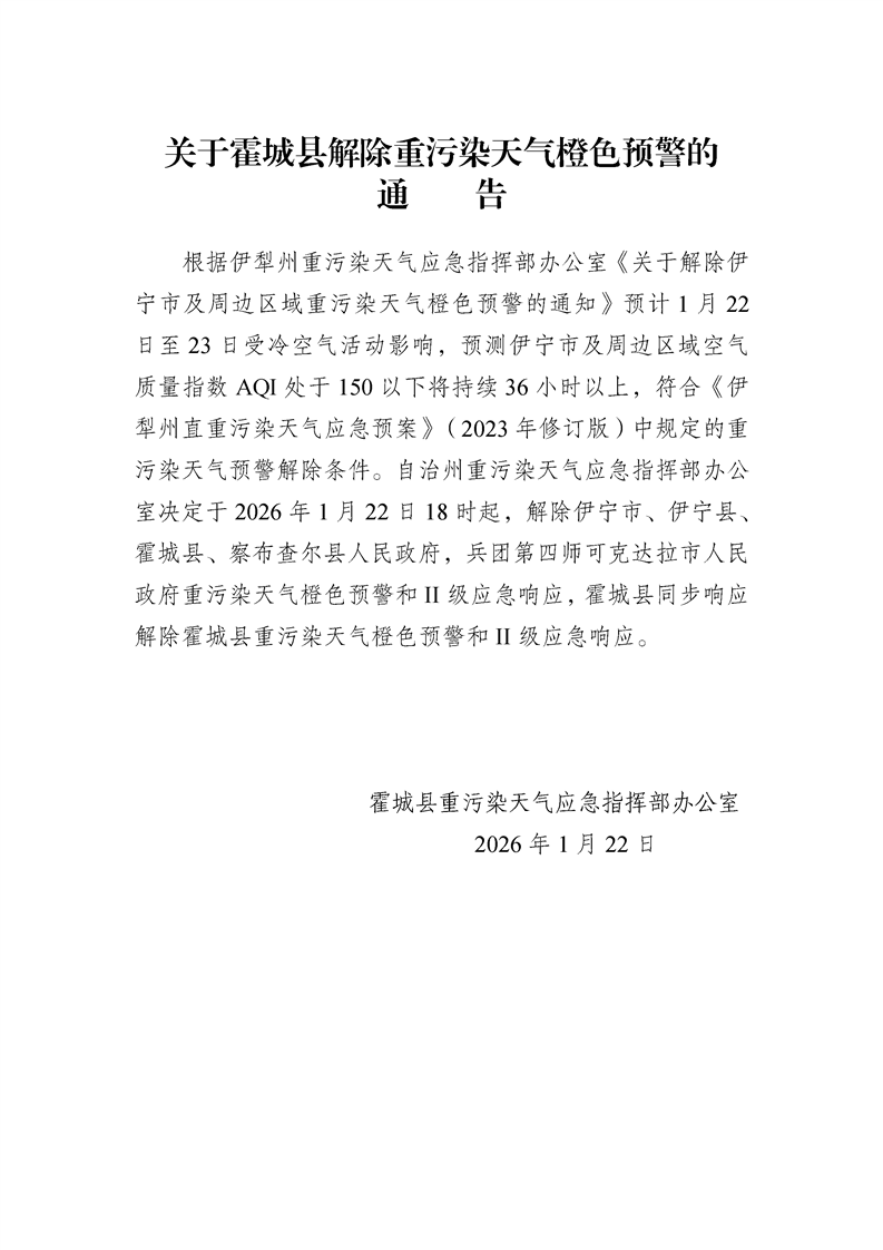 关于霍城县解除重污染天气橙色预警的通告