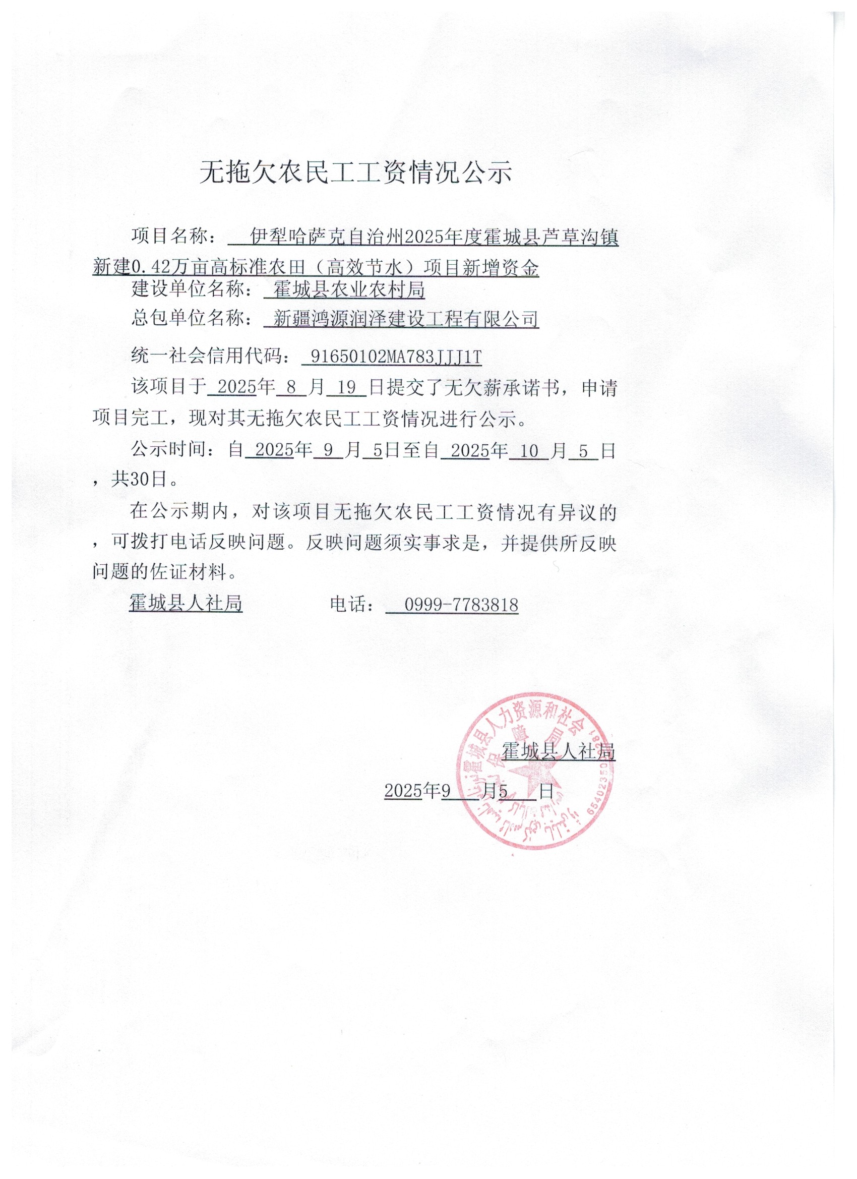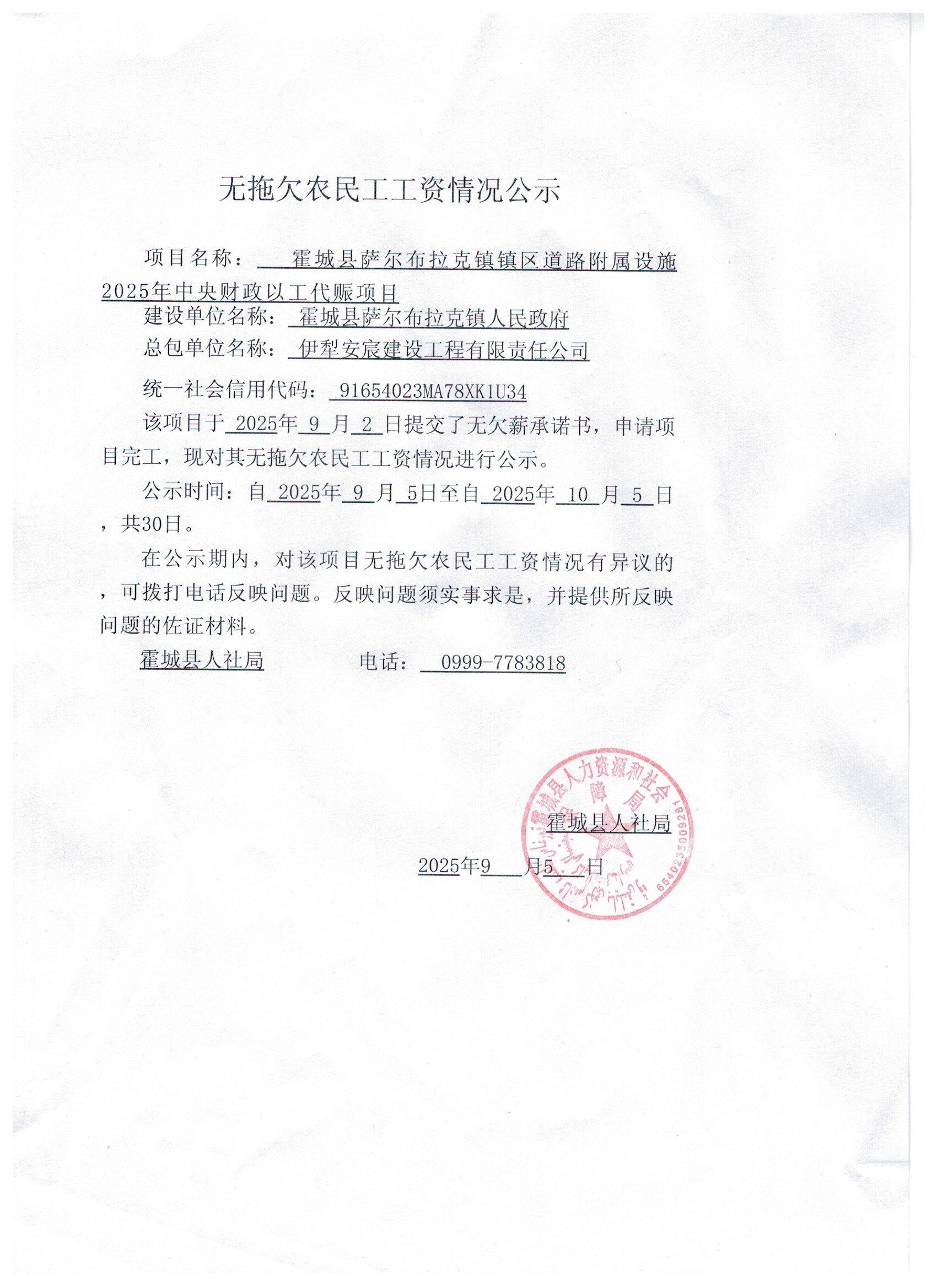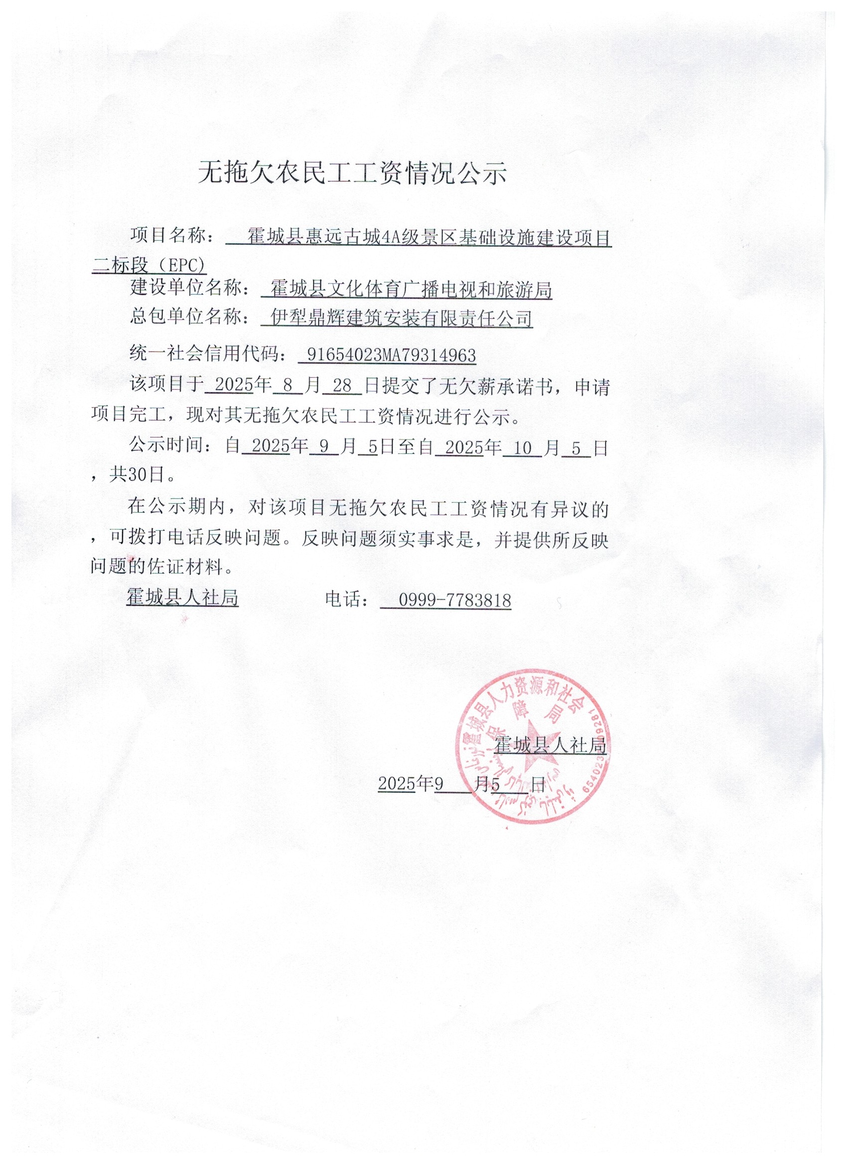 关于无拖欠农民工工资情况公示(惠远古城4A级景区基础设施建设项目二标段)